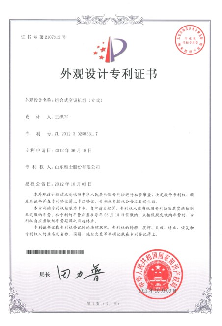 組合式空調機組(立式)專利證書